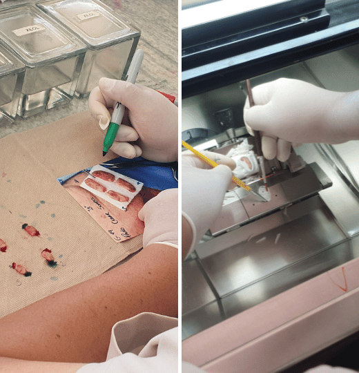 • Exame Completo das Margens: O tecido removido é examinado em 100% de suas margens periféricas e de profundidade, permitindo a detecção precisa de células cancerosas.
