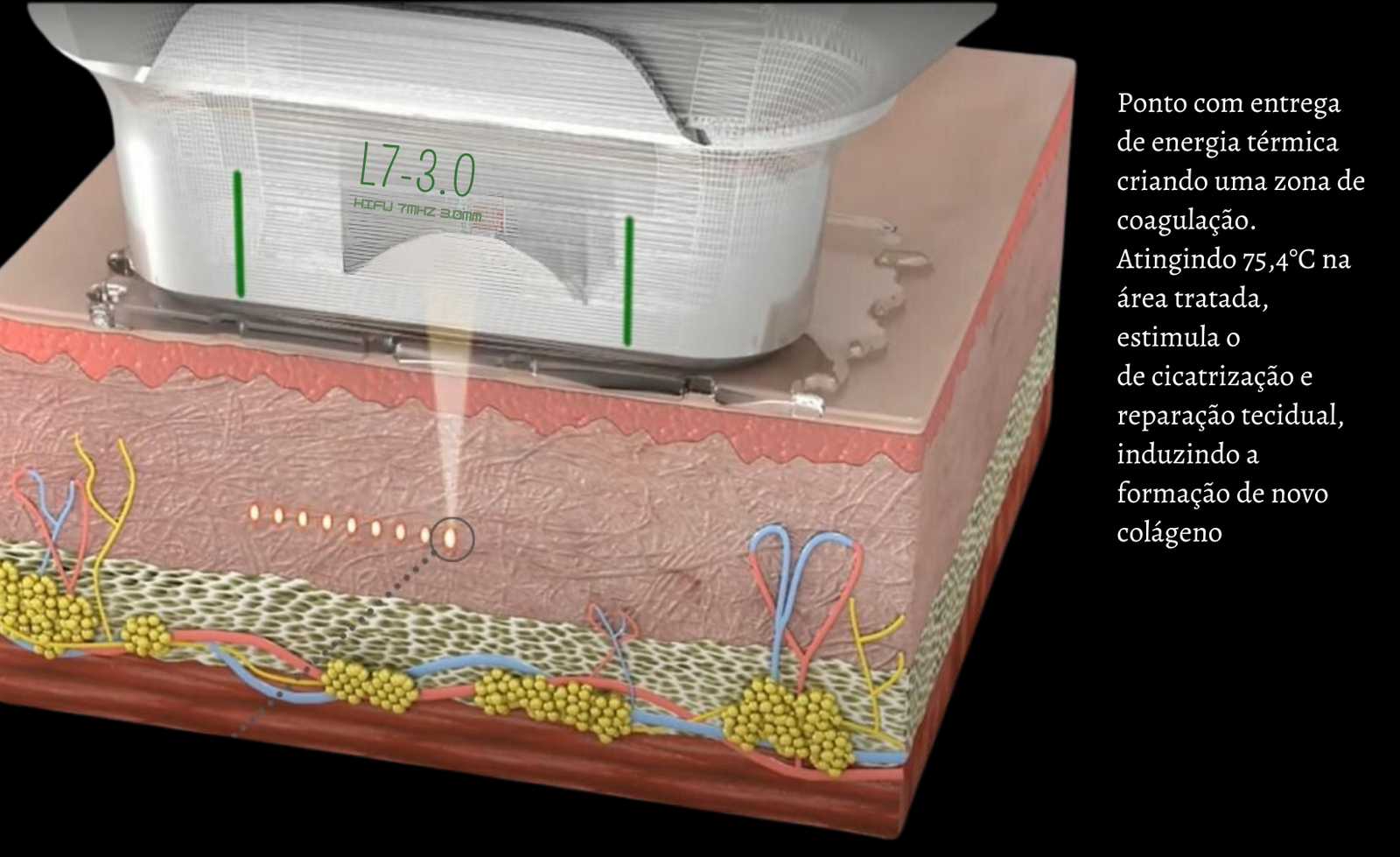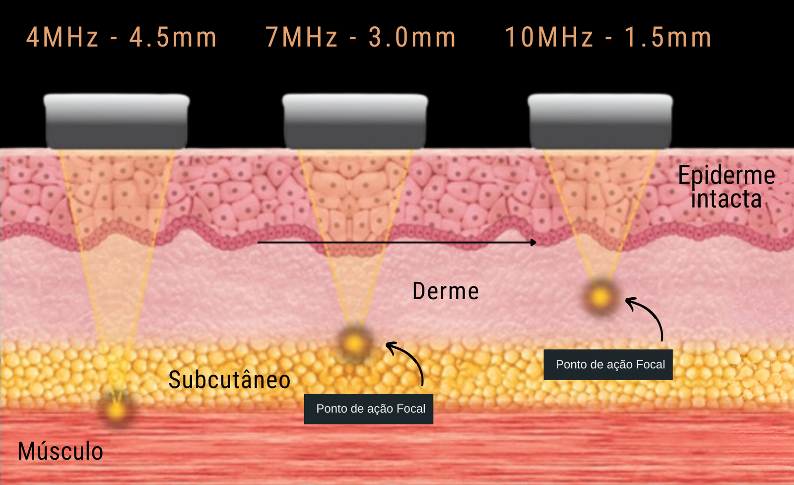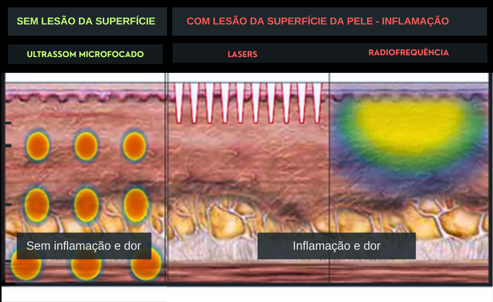 Já as ondas do ultrassom microfocado, agem de forma diferente. Elas simplesmente pulam essa parte superficial da pele, que era desnecessariamente agredida. O ultraformer gera uma microcauterização pontual diretamente na camada média da pele, poupando a superficial, que é onde estão os nervos, camada córnea e vasos sanguíneos.